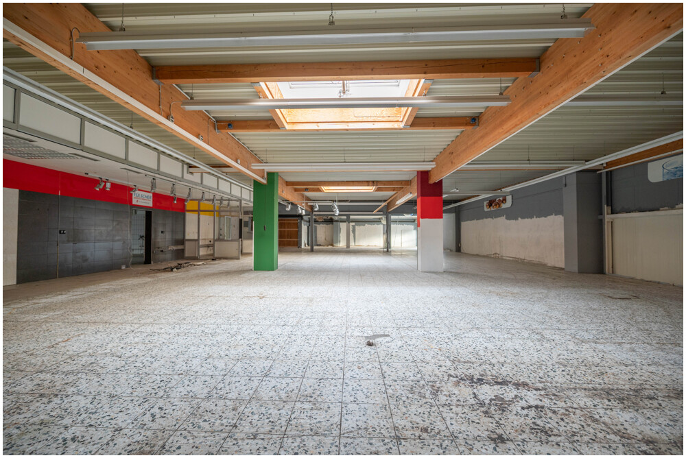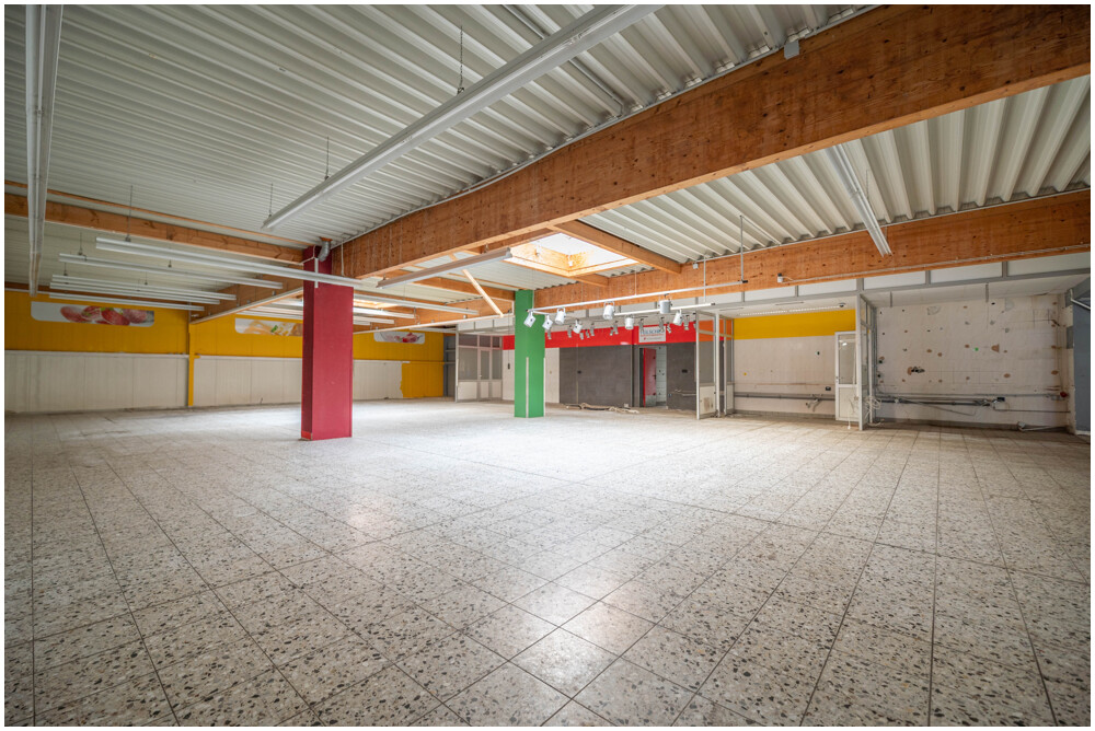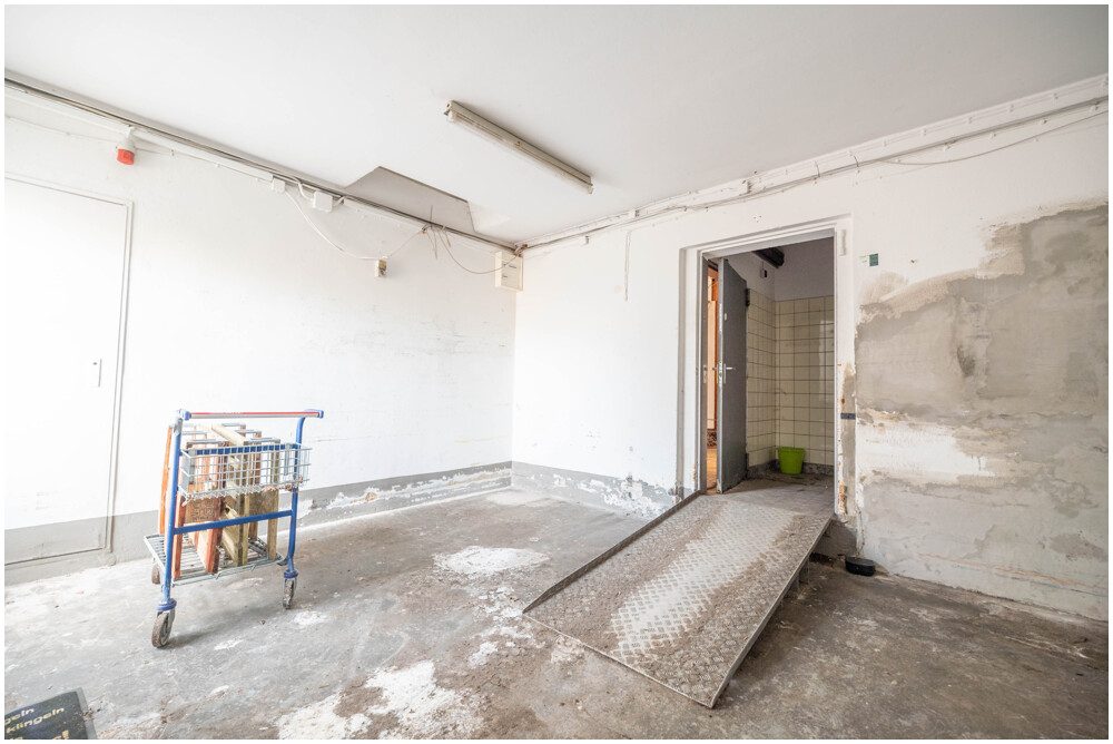 Der Zugang zur Gewerbeeinheit erfolgt über den straßenseitigen Eingangsbereich. Die Ladenfläche präsentiert sich als großflächiger, offen gehaltener Raum mit Oberlichtern, die für Tageslicht sorgen. Ergänzend stehen Nebenflächen zur Verfügung, darunter Lagerbereiche sowie ein Raum mit angeschlossenem Kühlhaus, was insbesondere für Konzepte mit Warenlagerung oder temperaturgeführter Aufbewahrung interessant sein kann.