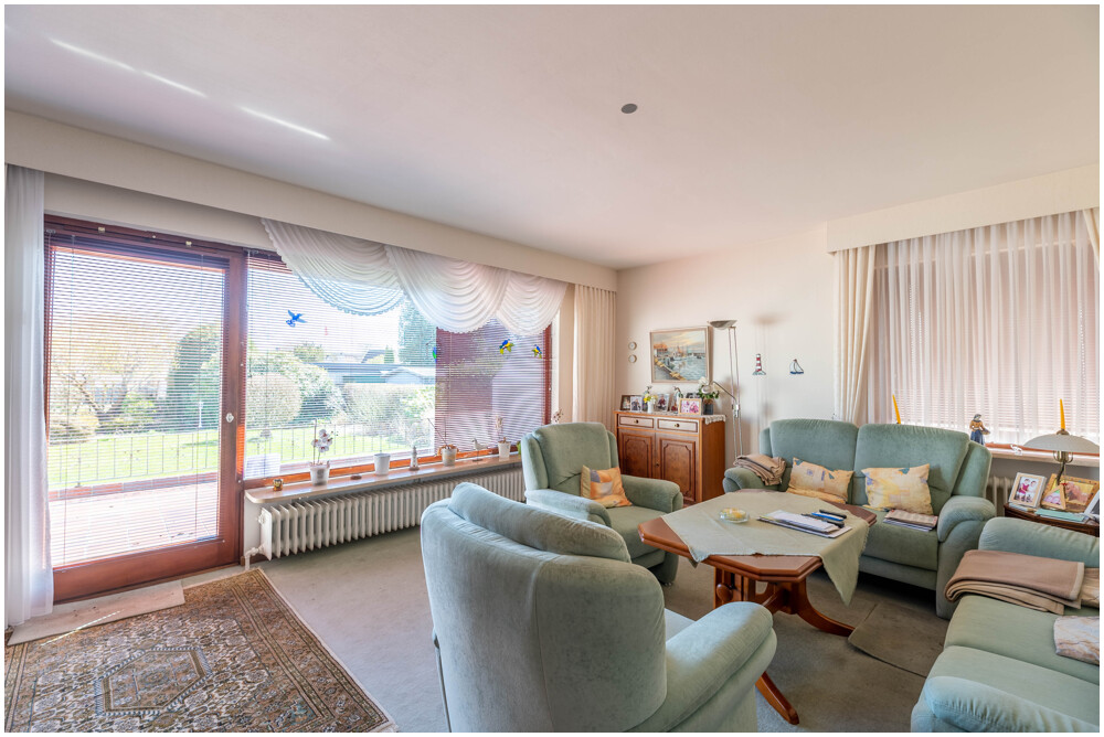 Schon beim Eintreten empfängt Sie ein freundlicher Flur, von dem aus sich die Räume im Erdgeschoss gut erschließen. Der Wohnbereich wirkt durch die großzügigen Fensterflächen hell und einladend und öffnet sich zur Terrasse – ein schöner Übergang in den rückwärtig gelegenen, ruhigen Garten. Auf dem ca. 800 m² großen Grundstück finden Sie reichlich Platz zum Spielen, Gärtnern oder einfach zum Abschalten im Grünen.